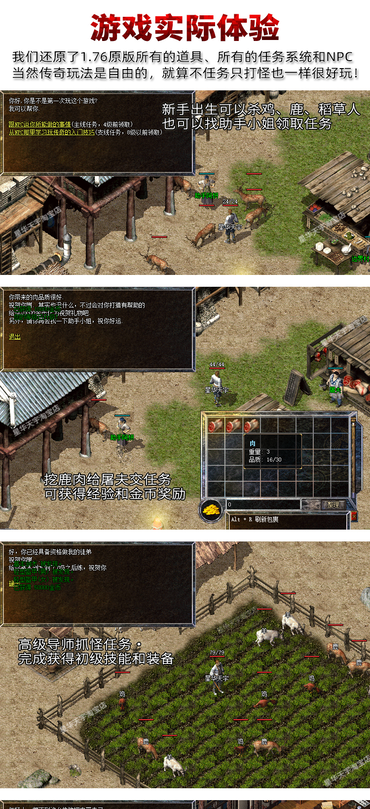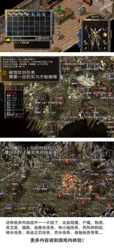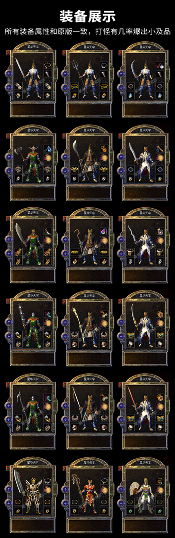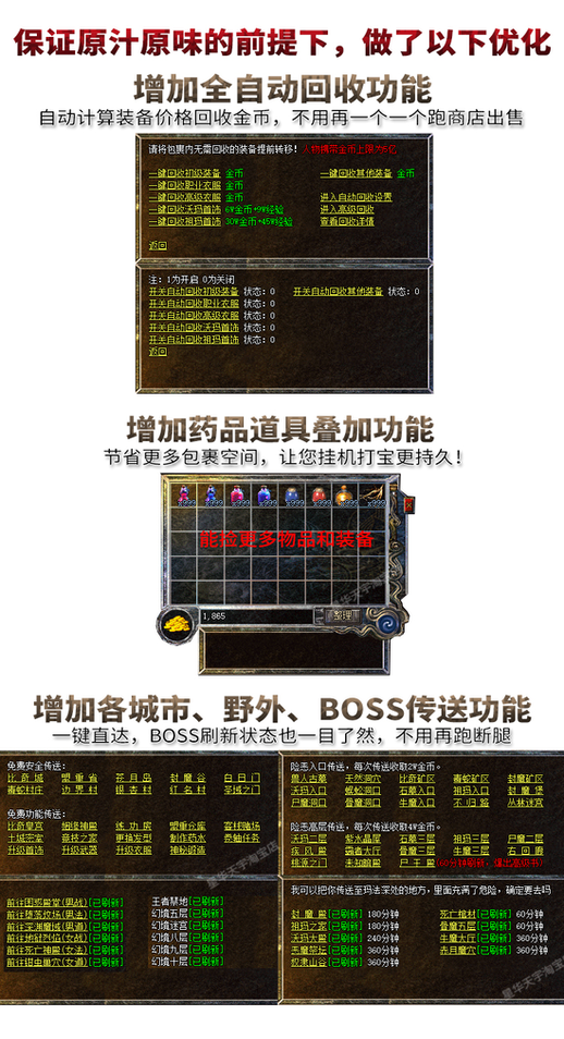 此版本还原了1.76和之前所有版本,包括著名1.10三英雄传说的40级职业装,1.28富甲天下的赌场系统,1.50版虎卫传说的虎卫、鹰卫,1.60版热血神鹰的虹魔、魔血套,1.70版魔神归来的师徒,装备排序:沃玛套-祖玛套-赤月套(封顶) 原版1.10-1.76所有地图,全智能假人系统,自动发育换装,和真人相似度99%,全自动回收金币功能,配合自动挂机,从此解放双手。